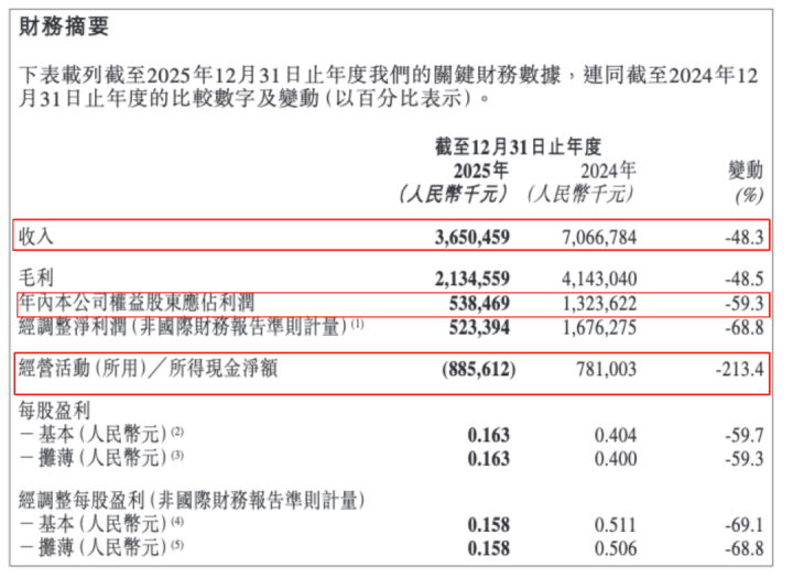 近日,珍酒李渡(06979.HK)发布的功绩公告自满,2025年公司营收同比下跌48.3%至36.51亿元,归母净利润则跌至5.39亿元,同比下跌59.3%。