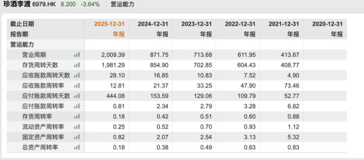 人所共知,贸易周期由存货和应收账款的盘活天数组成。2025年末,珍酒李渡的存货盘活天数与应收账款盘活天数,鉴别为1981天和28天。
