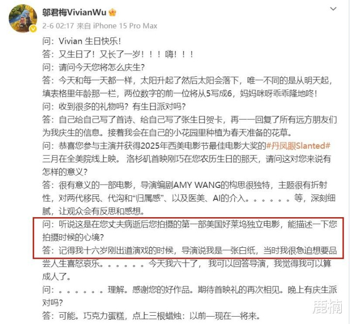 2026年2月5日,邬君梅迎来六十岁大寿。