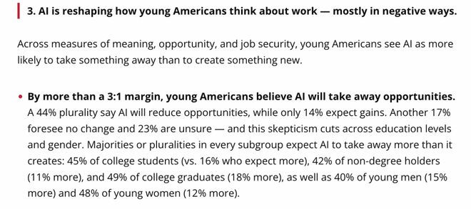 哈佛大学最近的一项访问炫耀,在18至29岁的好意思国年青东谈主中,59%的东谈主将AI视为业绩出息的要挟。