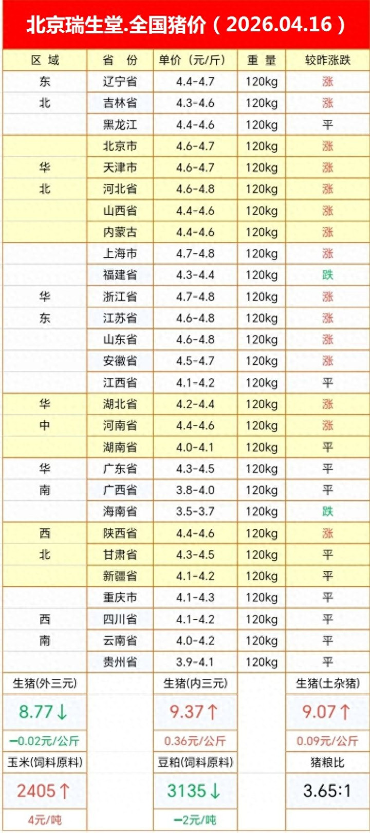 2026年4月16日发布的世界生猪价钱数据高傲,世界猪价一改此前一语气低迷态势,呈现出涨多跌少、区域分化的回暖形态,中枢产区集体高潮,同期猪粮比跌至3.65:1,创下近期低位,开释出行业深度磨底后的企稳信号。蛊卦世界各区域价钱走势与饲料原料行情,咱们一同拆解现时猪市的中枢逻辑与改日走向。