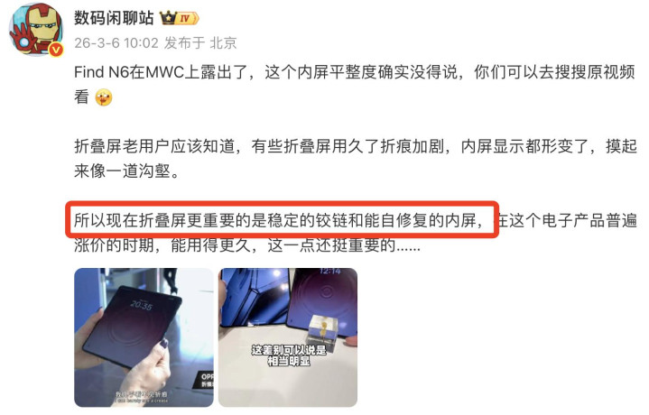 而在MWC媒体中心,凤凰卫视记者王冰汝径直把Find N6带进了国外记者堆里,让那些摸惯了三星、谷歌、苹果的科技老炮们上手把玩。效果全场“Amazing”和“Impressive”门庭若市,老外王人说“莫得折痕,着实看不见。”