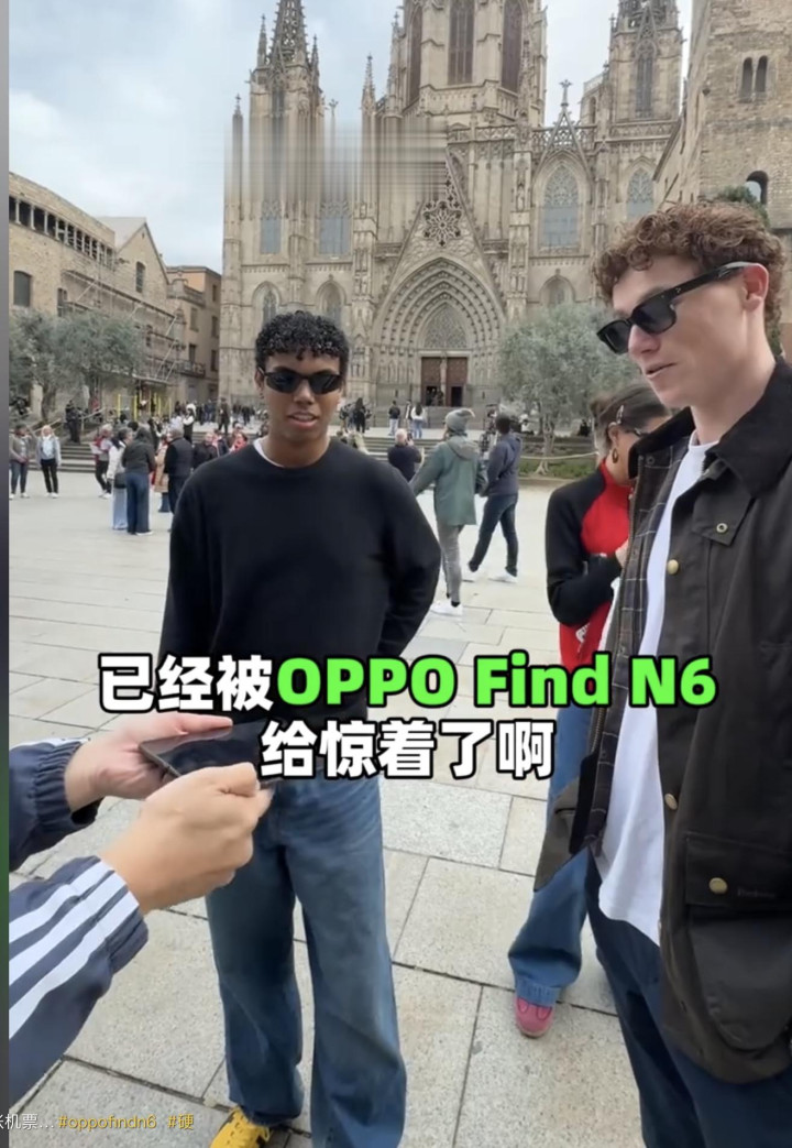多位科技博主带着OPPO Find N6逛展、街头实测,眩惑了广漠老外的退换。其中毒角SHOW拿着Find N6在巴塞罗那街头随即拦下路东说念主,让他们武断折叠、玩游戏,致使误觉得是苹果折叠屏,暗示手机看不到折痕,当得知是OPPO Find N6时,全场只剩咋舌。