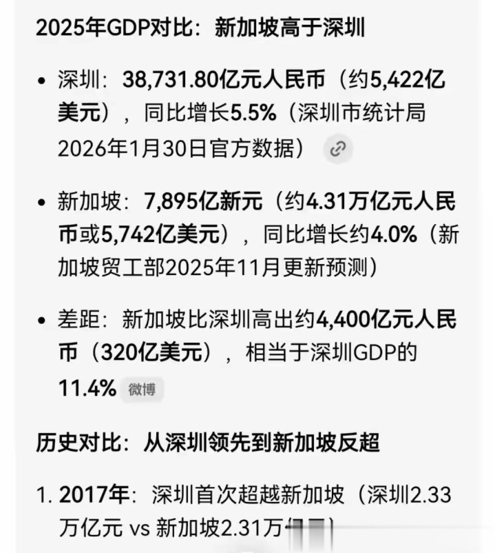 2025年,深圳GDP为3.87万亿元东谈主民币,新加坡则达到4.31万亿元。若按当年平均汇率折算,两地以好意思元计量的经济总量收支约320亿好意思元。一个引东谈主善良的风物是,这一差距较十年前(2016年仅差25亿好意思元)昭彰扩大了。